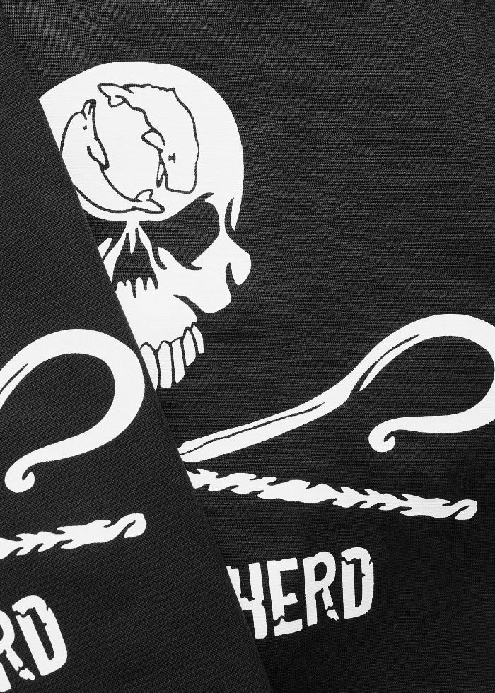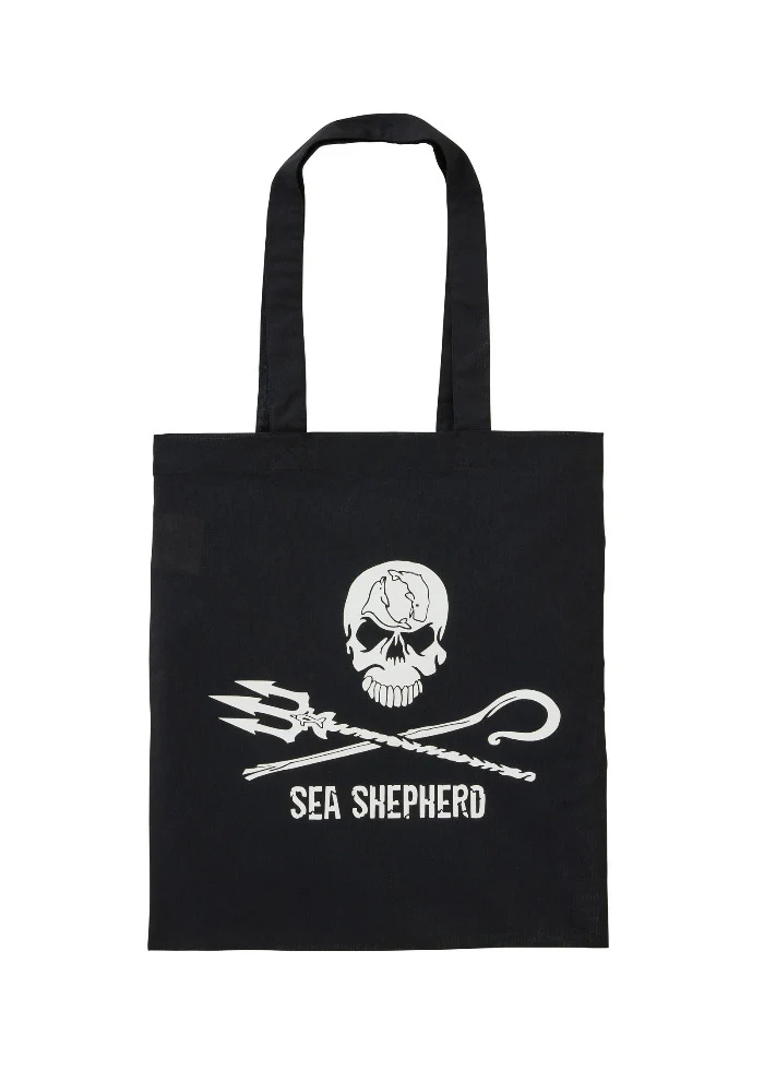 Das Jolly-Roger-Logo zeigt unsere eigene kreative Version der Piratenflagge. Es wurde von dem Künstler Geert Vons entworfen und zeigt, wofür wir stehen. Der gekreuzte Hirtenstab und Neptuns Dreizack sind das Symbol für unsere Wache über die Lebewesen in den Ozeanen und unsere Entschlossenheit für sie zu kämpfen, damit sie frei im Meer leben können. Der Totenkopf repräsentiert den Tod, den die Menschheit den Ozeanen bringt. Yin und Yang – Wal und Delfin – hingegen symbolisieren unser Ziel, die See wieder ins Gleichgewicht zu bringen, die Anmut der Delfine und die Weisheit der Wale zu erhalten.