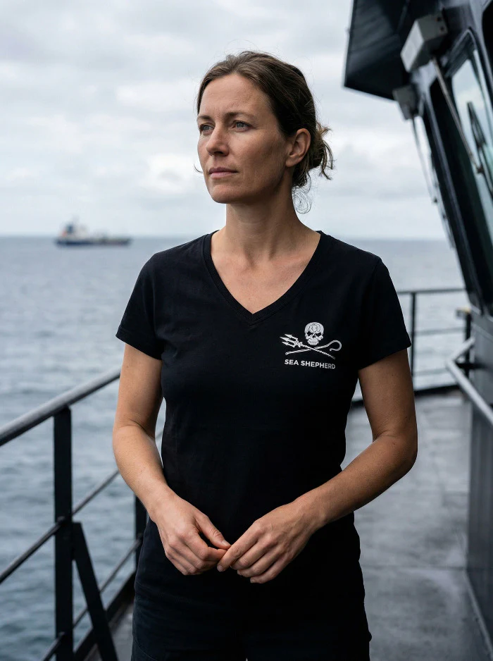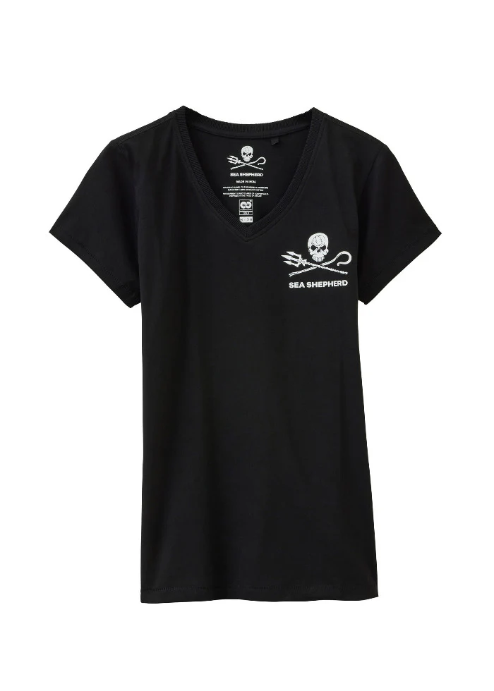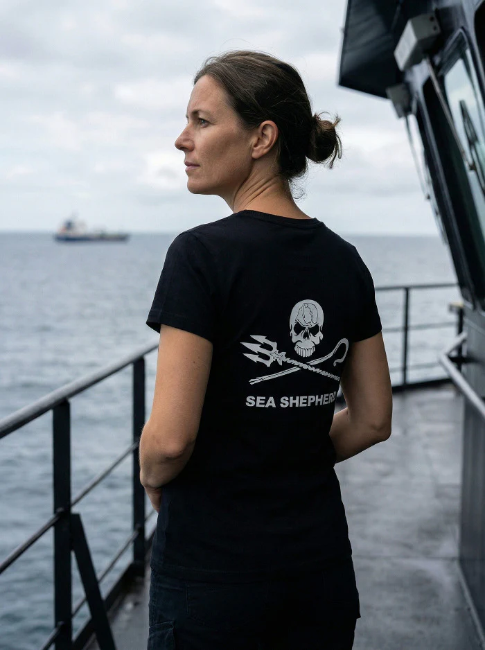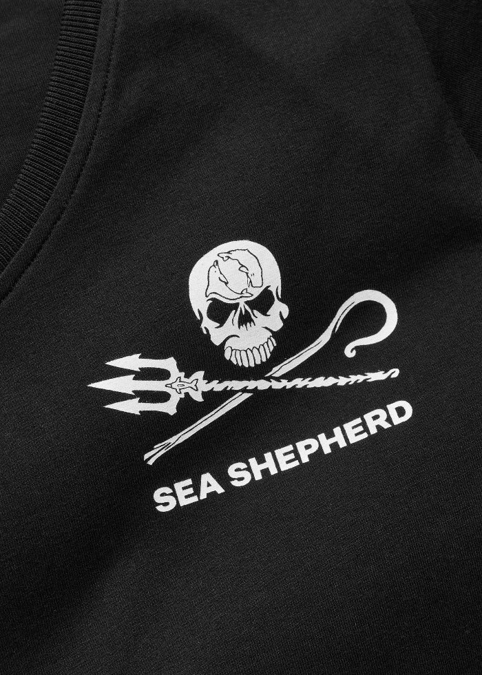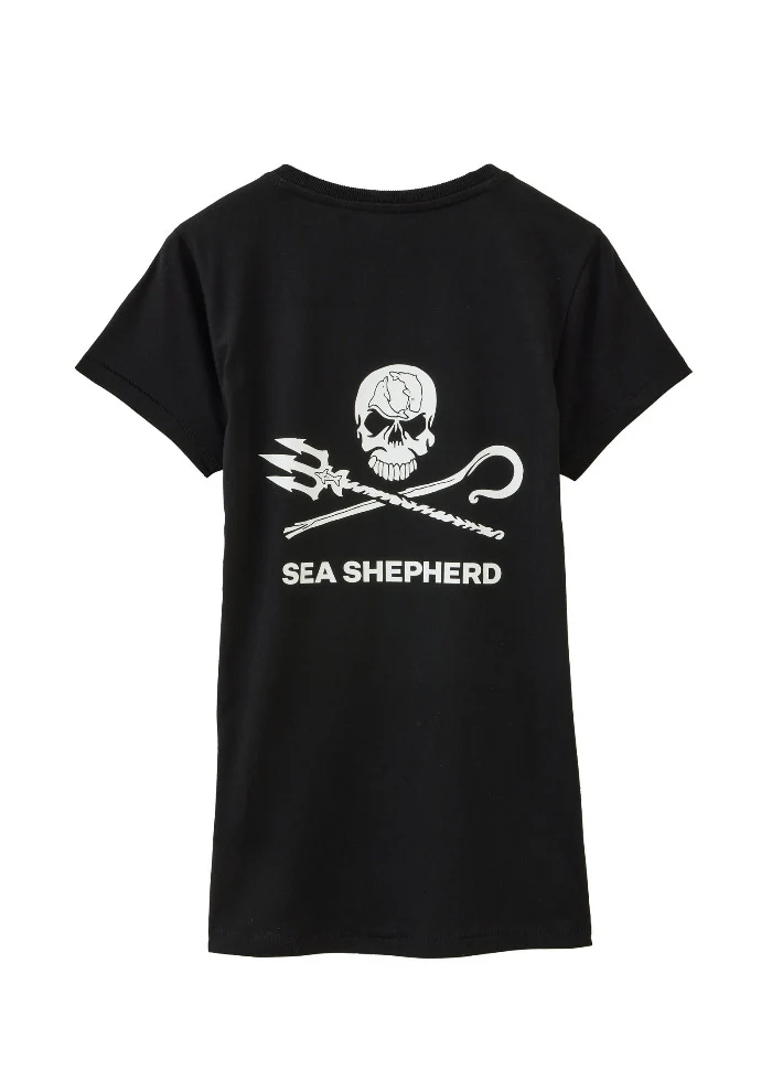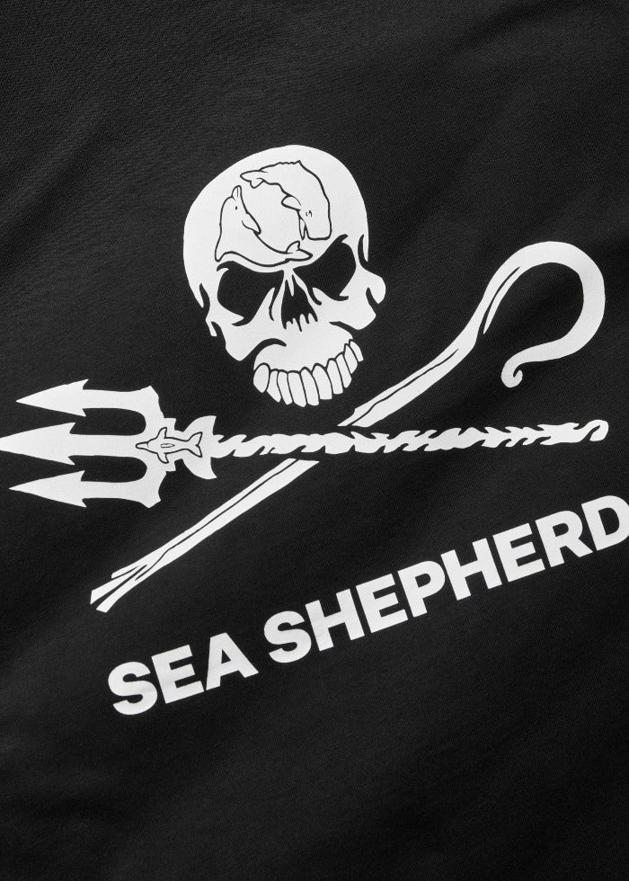 Es bedarf eines Piraten, um einen Piraten zu stoppen! Das stellten schon Henry Morgan und Sir Francis Drake vor mehreren Jahrhunderten unter Beweis. Das „Jolly Roger“ Logo zeigt unsere eigene kreative Version der Piratenflagge. Es wurde von dem Künstler Geert Vons entworfen und zeigt, wofür wir stehen. Der gekreuzte Hirtenstab und Neptuns Dreizack sind das Symbol für unsere Wache über die Lebewesen in den Ozeanen und unsere Entschlossenheit für sie zu kämpfen,damit sie frei im Meer leben können. Der Totenkopf repräsentiert den Tod, den die Menschheit den Ozeanen bringt. Yin und Yang – Wal und Delfin – hingegen symbolisieren unser Ziel, die See wieder ins Gleichgewicht zu bringen, die Anmut der Delfine und die Weisheit der Wale zu erhalten.
