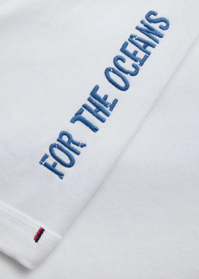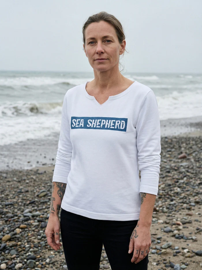 Mit unserem weißen Sweater haben wir ein neues nachhaltiges Basic, auf das du sicher nicht mehr verzichten möchtest. Die Baumwolle fühlt sich extra kuschelig auf der Haut an und sorgt für ein leichtes Tragegefühl. Eine am Rücken verlaufende Naht sowie der weite Halsausschnitt sorgen dazu für einen lässigen Style. Auf der Brust ist ein blauer Druck, der den Schriftzug SEA SHEPHERD deutlich hervorhebt. Und mit dem gestickten Detail FOR THE OCEANS wird auch die Rückseite zu einem interessanten Blickfang.