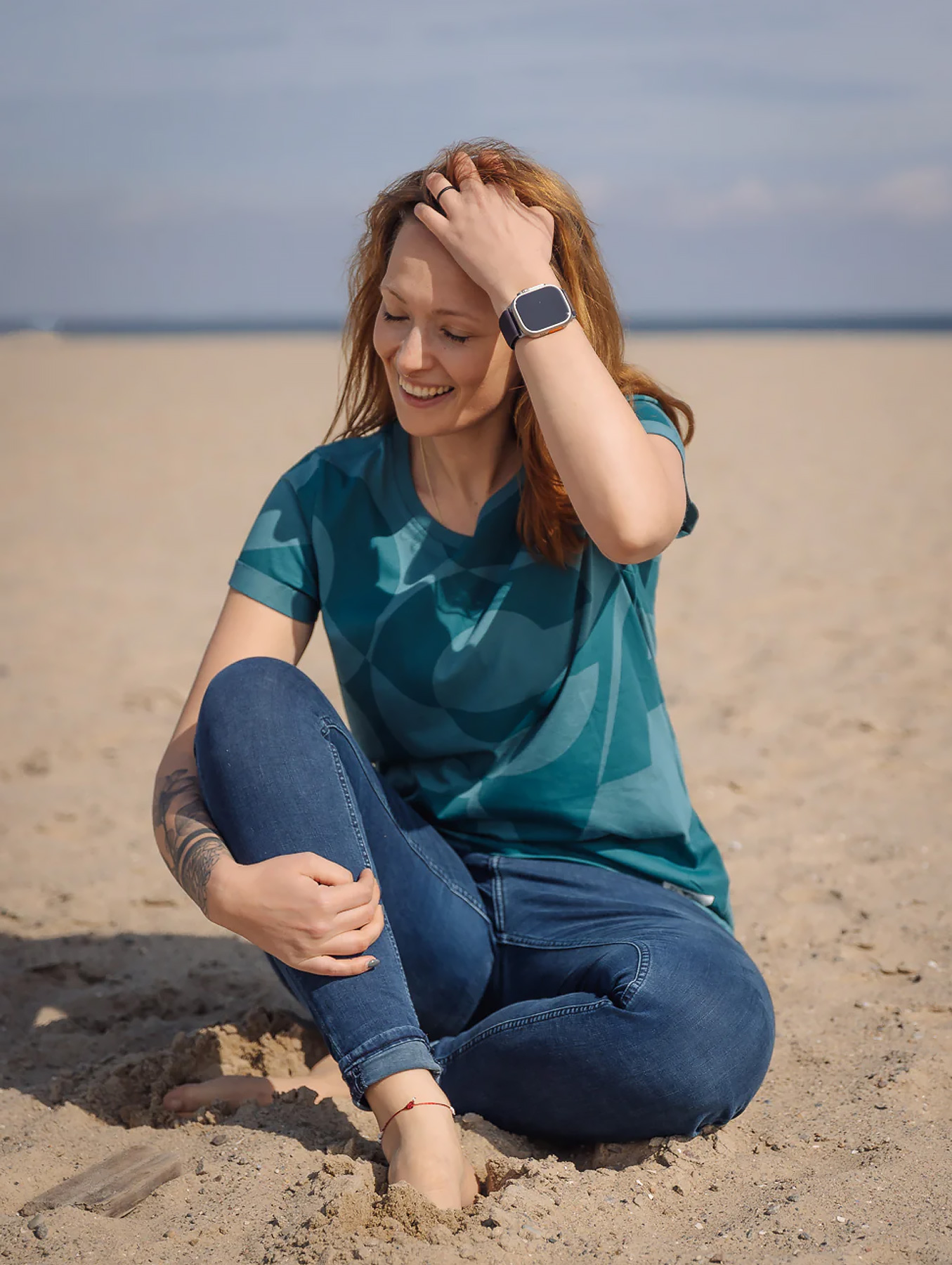 So farbenfroh wie die Ozeane. Mit diesem Shirt bringen wir mal etwas Farbe in deinen Kleiderschrank und liefern dir das perfekte Kleidungsstück für den Sommer! Das Design überzeugt mit einem grafischen Motiv in zwei ähnlichen Farbnuancen und einem kleinen Logo-Aufdruck auf der Vorderseite. Garantiert ein echter Hingucker, denn bei genauerer Betrachtung lässt sich auf dem Shirt das Wort „OCEANS“ erkennen.